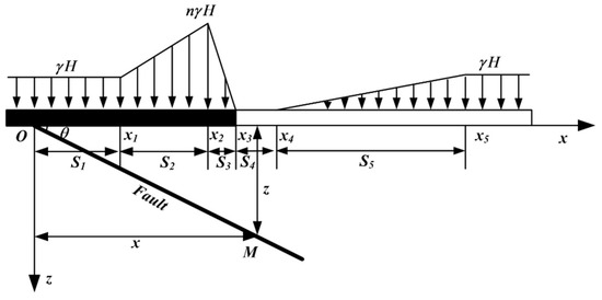 In order to study the influence that the mining advancing direction brings to fault activation, according to the above-mentioned abutment pressure distribution law of mining advance direction, we take the surrounding rock mass along the mining advancing direction of the working face in the central field as the research object in longwall mining. Here it can be treated as a plane strain problem. Assume that the floor rock mass is elastic; abutment pressure applied on the floor is simplified as a linear distribution load; the original rock stress as a uniform distribution load; the stress in stress-concentrated area as linear increase; the stress in stress-relaxed area as linear decrease; and the stress concentration factor ahead of the working face is n. Therefore, the mechanical model is established as Figure 3.