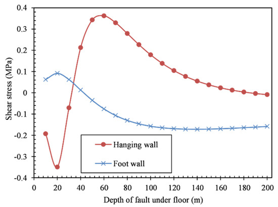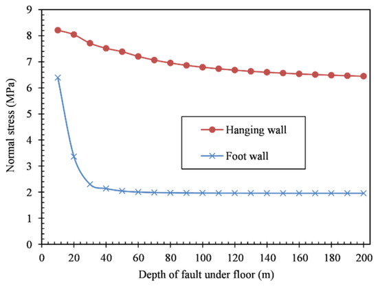 It can be seen from Figure 4 and Figure 5 that when the working face is 50 m apart from the fault, the normal stress on a fault below the floor range of 0~40 m has the largest change, which brings the largest disturbance to fault; when the depth is more than 40 m, the normal stress on a fault keeps a certain value, the hanging wall advance stays around 6.5 MPa, and the foot wall advance stays around 2.0 MPa. The normal stress on the fault advancing from the hanging wall, which causes larger disturbance, is always greater than that from the foot wall. The variation range of shear stress distribution on a fault advancing from the hanging wall is larger than that from the foot wall, i.e., −0.35~0.36 MPa from the hanging wall, and −0.17~0.09 MPa from the foot wall, respectively. With the increase of depth, the shear stress appears to be stable from foot wall advance. Before the mining advances to a fault, hanging wall advance is easier to cause the fault activation, because there are dramatic changes of the shear stress distribution, large peak values, and wide ranges of influence on the fault.