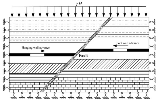 When mining advances from the hanging wall, the plastic failure zone caused by the floor is linked with the plastic zone near the fault first; on the other hand, when mining advances from the foot wall, the plastic failure zone caused by the roof is linked first. Therefore, when the working face approaches to the fault, plastic failure in the floor is largely affected by the hanging wall advance, and plastic failure in the roof is largely affected by the foot wall advance.