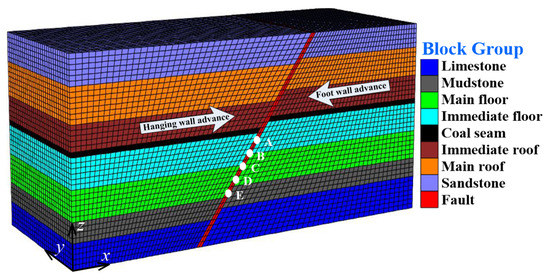To understand the stress variation on faults and the distribution characteristics of floor and roof plastic failure near the fault, the simulation software of FLAC3D is applied in this study for further numerical work. FLAC3D is a finite difference numerical simulation software. There are twelve elastic and plastic constitutive models and five calculation modes built in the software, which can realize the coupling between different modes. In addition, the built-in FISH program language can obtain the coordinates, displacement, stress, strain and other parameters of nodes and units in the calculation process. It can well simulate geological materials’ mechanical behaviors, such as plastic flow or damage, when they reach the yield limit or strength limit. Besides, it can also analyze the gradual damage and instability, and track the gradual failure of materials. Therefore, this software has been widely used in the field of geotechnical engineering.