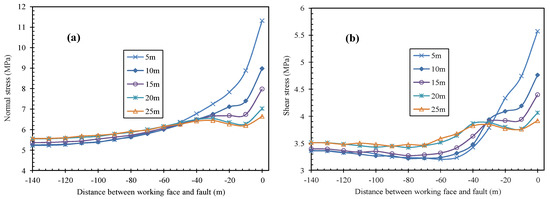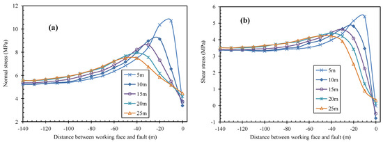 Figure 9. Stress change curves of the fault when mining advances along the foot wall: (a) normal stress; (b) shear stress.