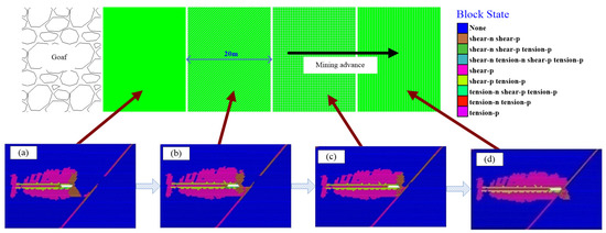 Comparing Figure 13a,c, when the distance between the working face and fault is −100 m, the height of the plastic zone in the hanging wall is 20–25 m, while that in the foot wall is 15–20 m. In the comparison of Figure 13b,d, when the working face advances to 100 m away from the fault, the depth of the plastic zone in the hanging wall (more than 25 m) is much larger than that in the foot wall (5–10 m). It is concluded that, at the same advancing distance, the height and depth of the plastic zone in the hanging wall is larger than that in the foot wall, which is also in line with the simulation results.