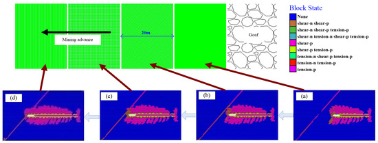 Figure 10. Distribution of plastic zone with mining advance along the hanging wall. Distance between working face and the fault: (a) 60 m; (b) 40 m; (c) 20 m; (d) 0 m.