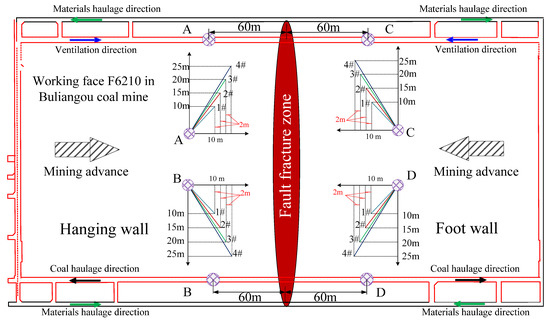 To verify the validity of simulation results, the water injection leak detection method [39] is designed to observe the development of the plastic zone during the mining advancement. In this method, a higher flow rate of leakage means more severe plastic damage to the borehole, and the rapid increase in flow rate represents the connection of fractures near the borehole. As shown in Figure 12, Points A, B, C and D are set to monitor the plastic zone development in both roof and floor of the hanging wall and foot wall 60 m apart from the fault. In each monitoring point, four boreholes for different minoring depths were arranged, numbered 1#, 2#, 3# and 4#, respectively. The horizontal distance between the boreholes was 2 m, and the vertical distance was 5 m.