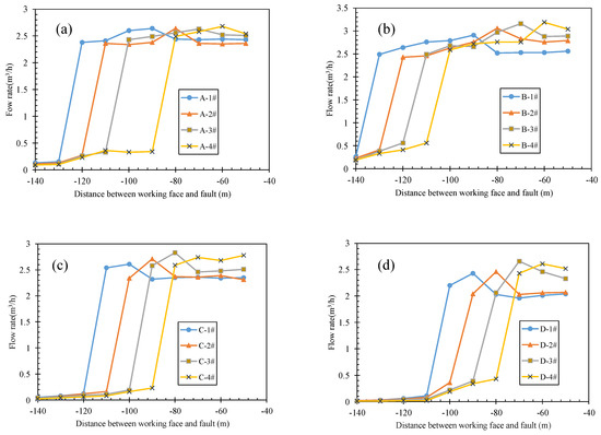 As the working face advances in the foot wall, the size of the plastic zone in the roof and floor also increases. As shown in Figure 13c, when the working face is 110 m apart from the fault, the flow rate of the C-1# borehole increases to 1.18 m3/h, which indicates that the height of the plastic zone in the roof is 10–15 m. When the working face is 80 m apart from the fault, the height of the plastic zone is more than 25 m. Similarly, as shown in Figure 13d, the plastic zone depth is 10–15 m when the working face advances 100 m apart from the fault. When the working face is 70 m apart from the fault, the depth of the plastic zone in the roof reaches 25 m. In the comparison of Figure 13c,d, the advance from the foot wall had a greater impact on the roof, which corresponds with the simulation results.