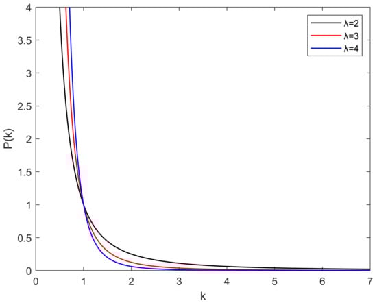 where k is the node degree, represents the probability distribution of the node degree, and the power exponent is a parameter describing the network structure characteristic. Figure 2 is the function image of Equation (5). As seen, the node degree k increases, and decreases, that is, a few nodes in the SN have a larger degree.