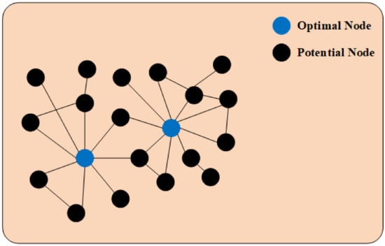 The biggest advantage of FA is to update the position by fireflies attracting each other. Figure 3 shows the SN topology. A few hub nodes (blue nodes) have a larger degree and are called optimal nodes, and most nodes (black nodes) have a smaller degree and are called potential nodes. Corresponding to FA, a small number of optimal individuals are in the hub position of the population, and have a greater impact on guiding the evolution direction. For the potential individuals, they have less impact on the algorithm performance.
