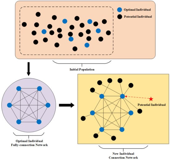 Barabási et al. proposed a concise SN construction model (i.e., B-A model). The process mainly includes two parts: First, select some optimal individuals in the population to form a fully-connected network. Then, the remaining individuals are respectively connected to the network through loops, and the individuals with larger node degrees can be connected. Figure 4 shows the construction process of the SN topology population. The detailed steps are described as follows: (1) Evaluate the fitness value after population initialization, and sort the population according to the fitness value; (2) select some better individuals from the population as the optimal individual, and these better individuals will be connected to a fully-connected network; (3) in the iteration, the remaining potential individuals use a roulette selection algorithm to connect to the fully-connected network. The proportion of the node degree to the total node degree is called the degree ratio. The degree ratio and cumulative probability are defined as follows: