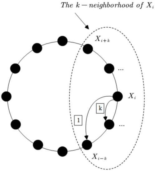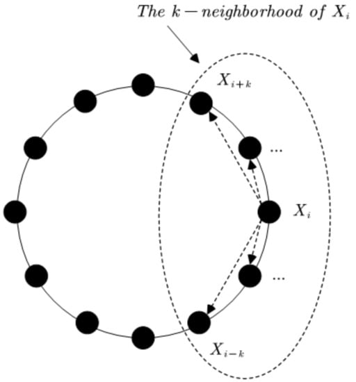 In RN, all firefly individuals in the population are arranged in a ring topology. If the firefly individuals’ indexes are adjacent to each other, they will be directly connected in the RN topology. However, this stipulates that the first individual is connected with the last individual for the special condition. The K-neighborhood of each individual contains fireflies, i.e., , , …, , , , …, , . The NA model was first proposed by Wang, and the attraction among the fireflies only occurred in their K-neighborhood. The current selected firefly individual is compared with the remaining individuals in the K-neighborhood, and if the fitness value in the remaining individuals is better, the movement is carried out. Figure 5 clearly shows the mechanism of the NA model. However, in the RN topology population, other individuals’ indexes are set to , , …, , i, that is, the individual needs to compare with k individuals. However, the average attractions of each firefly are in the standard FA, while the RN topology population only has at most. It can be seen that the RN topology population attraction mechanism effectively lowers the computational complexity. Figure 6 is the attraction model in the RN topology population.