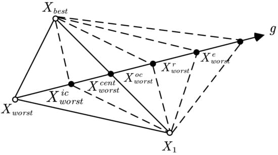 The Nelder–Mead Simplex Method (NMSM) was first proposed by Nelder and Mead in 1965 [35]. This method mainly uses operations such as reflection, expansion, inner contraction, and outer contraction to find a better solution and replace the worst individual in the population. This process is repeated until the termination condition is met, where and represent the best individual and the worst individual in the population, respectively. is the second-worst individual in the population. is the center point of all points except . , , , and represent the reflection point, expansion point, and inner and outer contraction points, respectively. Figure 7 shows the location of different points in the NMSM.