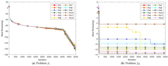 It is clear from Table 2 and Table 3 and Figure 8 that the setting of the parameter Pa1(10, 9) can obtain the optimal value in most cases, but to further verify the validity of the parameter settings, Table 4 gives the Friedman and Wilcoxon results of 12 groups of parameter settings, listing the mean rank of DPTCFA under different parameters. The Friedman test and Wilcoxon test can be used to represent the algorithm difference for problem solving the benchmark function to verify the algorithm stability. The larger the test result, the greater the difference in the algorithm’s ability to solve the problem, and the worse the algorithm stability [38]. As seen, the mean rank of Pa1(10, 9) is the smallest, so Pa1(10, 9) is the best choice for the inspection test. Based on the non-parametric test, Pa1(10, 9) was set to (, ) in the next experiment.