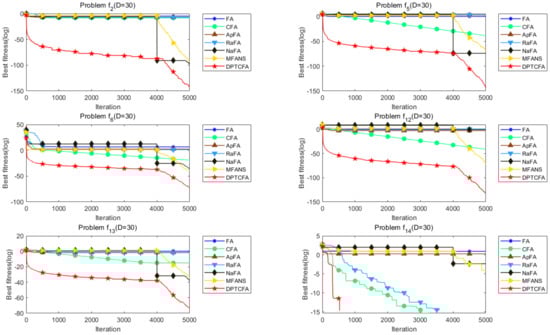 For the above seven algorithms, the population size N and the maximum iteration number were set to 30 and 5000, respectively. For the standard FA and ApFA, the parameters , , and were set to 0.5, 1.0, and , respectively. The parameter settings of CFA, RaFA, and NaFA can be found in the relevant literature [15,16,17]. In MFANS, the neighborhood size k and the preset probability were set to 2 and 0.05, respectively. , , k, and were respectively set to 10, 9, 6, and 0.05 in DPTCFA. Finally, each algorithm was run 30 times in the same environment, and the average optimal fitness value was recorded. Table 5 shows the comparison results of DPTCFA and other FA variants on . The “Mean” in the table represents the average optimal fitness value, and the optimal results are indicated in bold. Obviously, the proposed algorithm (DPTCFA) obtained better results on most benchmark functions. Especially in 14 functions including , , –, , , and –, the function optimal value was obtained. On the function , the result of DPTCFA was slightly insufficient compared to ApFA. In addition to the above functions, DPTCFA received a poor result on the composite functions and . However, the CFA using the chaos map achieved better results. Furthermore, CFA, ApFA, RaFA, NaFA, and MFANS achieved 6, 4, 4, 6, and 6 function optimal values, respectively. Due to space limitations, Figure 9 only shows the convergence images of DPTCFA and the other six comparison algorithms on some functions ().