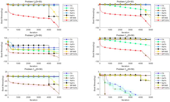 (1) Increasing the problem dimension: In addition to the 30-dimension experiment, the 7 algorithms were also tested with a 50-dimension condition. Table 6 lists the experiment results of the 7 algorithms on the 50-dimension. Figure 10 is the convergence image of DPTCFA and other FA variants in the case of . Similar to the convergence of , the increase in dimensionality did not make the DPTCFA effect worse, which verifies that the proposed algorithm has strong stability.