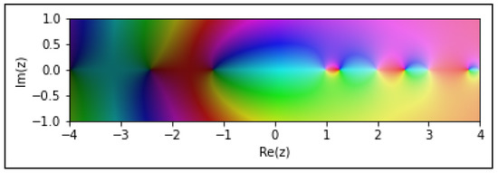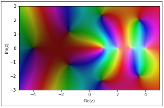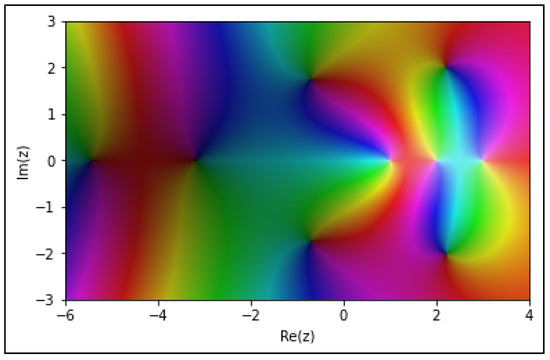 C-Shah–Riemann zeta function for : . Four poles of the function are observed as and , whereas three pairs of non-trivial complex root can be observed at and .