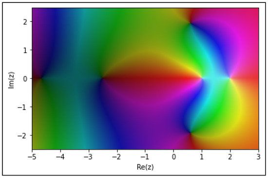 C-Shah–Riemann zeta function for : . Three poles of the function are observed as and , whereas two pairs of non-trivial complex root can be observed at and .