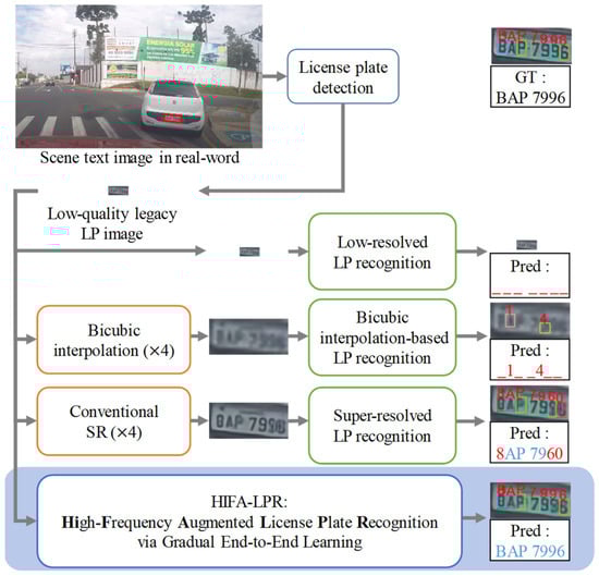 Scene text detection and recognition is a task that detects text regions and recognizes letters and numbers in image frames. This task can be utilized in various applications in smart parking and driving such as illegal parking detection and traffic sign recognition. When this task is applied to image frames in real-world scenarios, it does not assure satisfactory performance due to the varying resolutions of the input images. Specifically, this is a critical issue for the license plate recognition task. As shown in Figure 1, the plate regions detected in vehicle LP images may have small resolutions depending on the distance between the camera and the vehicle object. Even if the detected region images are input directly to the LP recognition module, it causes severe recognition accuracy degradation, as shown in the result of the low-resolved LP recognition approach in Figure 1. To address this problem, a bicubic-interpolation-based approach can be considered. However, this approach also generates low recognition accuracy with resized low-quality images, as shown in the result of the bicubic-interpolation-based LP recognition approach in Figure 1. To acquire high-quality LP images, super-resolution (SR) techniques can be considered. Nevertheless, conventional SR modules may not be suitable for enhancing recognition accuracy because the SR modules only focus on improving image quality, not recognition. For this reason, such an approach causes insufficient recognition performance, as shown in the result of the super-resolved LP recognition approach in Figure 1. Hence, in the real world, there is a necessity for an integrated model to improve LP recognition accuracy by restoring LP images in terms of LP recognition.