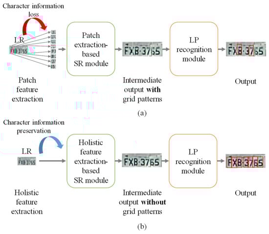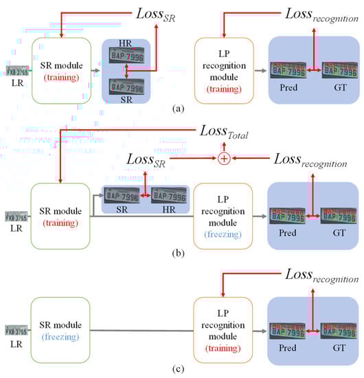 However, these SR modules only focus on image reconstruction. Since the SR modules cannot appropriately restore the image in terms of LP recognition, the recognition performance is degraded. To obtain better recognition performance, we propose a stepwise gradual end-to-end learning method using combined loss and weight freezing. Specifically, the above SR modules [,,,,,,,,,] generate grid patterns during the end-to-end training process due to patch-extraction-based approaches. The extracted patches that include insufficient character information hinder the optimization of the LP recognition module. To address this issue, we propose the holistic-feature-extraction-based SR module that takes the whole LP image as input. Since our method uses full character information, our SR module can be trained to improve LP character recognition compared with existing patch-extraction-based SR modules.