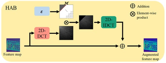 Our LP recognition module mainly consists of HABs which reinforce the high frequency of the feature map. As shown in Figure 5, the HAB receives the feature map as input. Then, the feature map is transformed into the DCT domain using 2D-DCT. To extract the high frequency in the DCT domain, the element-wise product of the feature map and frequency mask determined by hyper-parameter is conducted. The extracted high-frequency feature map is transformed into the spatial domain by 2D-IDCT. The obtained high-frequency feature map is added to the original feature map.