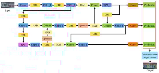Our LP recognition module based on high-frequency augmentation is illustrated in Figure 6. The Focus layer downscales the input image with as little information loss as possible for fast recognition by transforming input image space into depth. By transporting to a convolution batch normalization leaky ReLU (CBL) and a cross-stage partial (CSP) layer, feature maps obtain richer gradient combinations while maintaining lower computations. Moreover, by splitting the gradient flow, CSP reduces the computation of the architecture with the residual unit, which maintains the gradient of the neural network. Then, the feature map passes through the spatial pyramid pooling (SPP) layer to generate a fixed one-dimensional array as input to the fully connected layer to predict. The up-sample block performs up-sampling of the feature map to expand the feature map size, and it allows for small-object detection. Before the concatenation of each feature map, the proposed HAB is employed to exploit enhanced high-frequency information. Finally, the LP recognition module can obtain three different-sized feature maps to detect and recognize the characters of the LP image. The character recognition loss (localization, classification, and confidence losses) is obtained by comparing the result of the LP recognition module with the ground truth label. For training for LP recognition, we define 10 numerical classes for 0–9 and 26 character classes for A–Z. Algorithm 2 shows the pseudocode of the LP recognition module based on high-frequency augmentation.