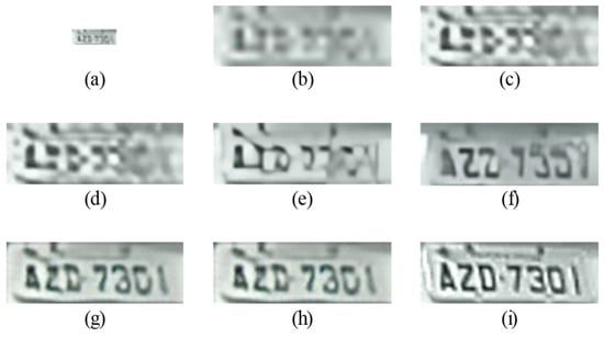 SR results on the LP image of the Greek vehicle dataset for scale factor (×4): (a) input low-quality legacy image (24 × 8), (b) Bicubic (96 × 32), (c) MZSR, (d) DRN, (e) SwinIR, (f) HIFA-LPR (Step 1), (g) HIFA-LPR (Step 2), (h) HIFA-LPR (Step 3), (i) HR image.
