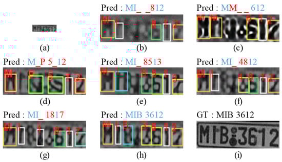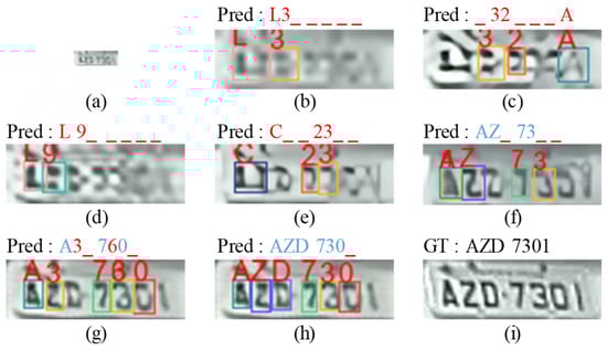 LP recognition results on (a) input low-quality legacy image (24 × 8), (b) bicubic image (96 × 32), (c) MZSR result, (d) DRN result, (e) SwinIR result, (f) HIFA-LPR (Step 1) result, (g) HIFA-LPR (Step 2) result, (h) HIFA-LPR (Step 3) result, (i) HR image. “_” denotes a missing character. Red character denotes an incorrect prediction. Blue character denotes a correct prediction. “GT” denotes ground truth. “Pred” denotes the prediction result.