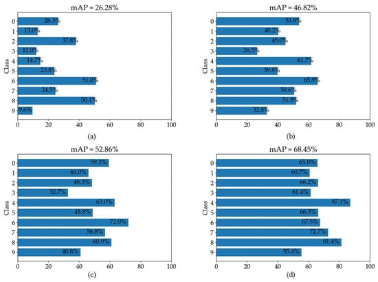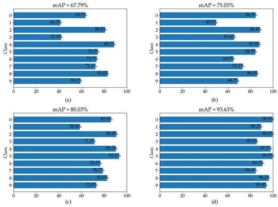 mAP comparison results for only numbers (0–9) on the UFPR dataset for scale factor (×4). (a–d) represent the mAP results on bicubic results, HIFA-LPR (Step 1) results, HIFA-LPR (Step 2) results, and HIFA-LPR (Step 3) results, respectively.