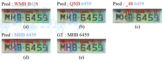 LP recognition results on same SR result (80 × 60). (a) Tesseract-OCR result, (b) OpenALPR result (c) Yolov5 result, (d) HIFA-LPR result, (e) HR image. “_” denotes a missing character. Red character denotes an incorrect prediction. Blue character denotes a correct prediction. “GT” denotes ground truth. “Pred” denotes the prediction result.