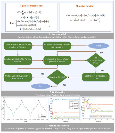 The methodology for the fractional swarming optimization approach for the harmonic identification model is described concisely in terms of mathematical development, process flow illustrations and pseudocodes. An overview of the methodology in terms of fundamental block structures is presented in Figure 1.