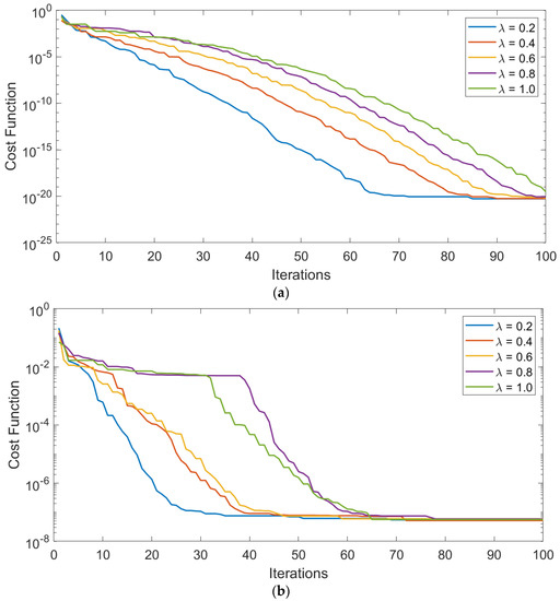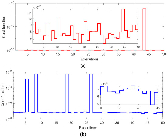 Analyses in terms of statistical indices of the minimum (Mini) value of cost function, the mean and standard deviation (STDD) were conducted and the results are reported in Table 4. The Mini values indicated that the FOPSO was accurate and convergent for all and with decrease in the precision of the estimates as the noise increased. The small STDD values in the case of = 0.1 were 6.23 × 10−22, 5.79 × 10−9 and 6.36 × 10−7 for = 200 dB, 70 dB and 50 dB, respectively, confirming the more reliable and consistently accurate behavior of the FOPSO for = 0.1. While the respective STDD values in the case of = 0.5 and = 1.0 were 7.07 × 10−4, 1.20 × 10−3 and 1.92 × 10−3, and 3.03 × 10−3, 3.23 × 10−3 and 2.45 × 10−3, respectively.