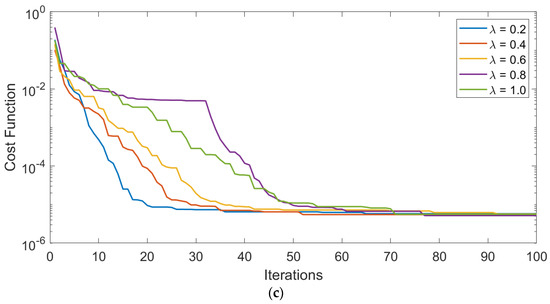 Cost function iterative adaptation for different noise scenarios. (a) 200 dB (b) 70 dB (c) 50 dB.