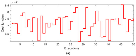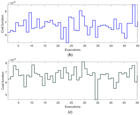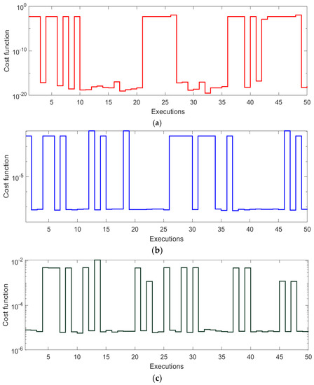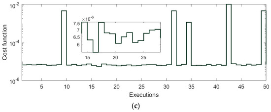 Furthermore, the reliability of the FOPSO was investigated through 50 autonomous executions; the results are presented in Figure 9, Figure 10 and Figure 11 for = 0.1, 0.5 and 1.0, respectively. Figure 9a, Figure 10a and Figure 11a present the plots for = 200 dB, while Figure 9b, Figure 10b and Figure 11b present the plots for = 70 dB. Figure 9c, Figure 10c and Figure 11c present the plots for = 50 dB. The results indicated that the proposed FOPSO was more reliable for = 0.1, with almost the same trend in independent trials of the scheme, while for the case of standard PSO (FOPSO for = 1.0), variation in the results was observed, i.e., sometimes giving good results and sometimes not, as shown in Figure 11.