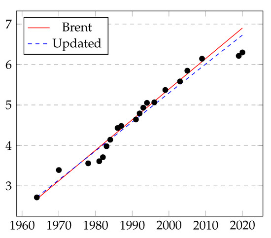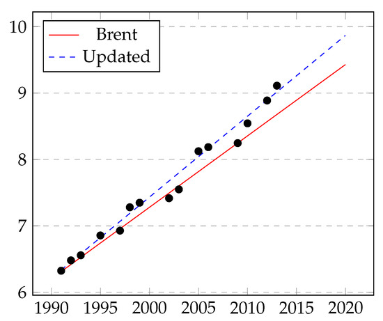 16]. Compared to Lenstra’s model, Brent uses known historical factoring records to predict the year a modulus of a given size will be factored. Using the least-squares fit, Brent obtains the following equation for the NFS
