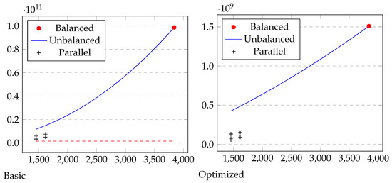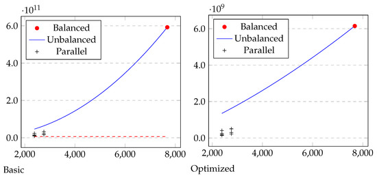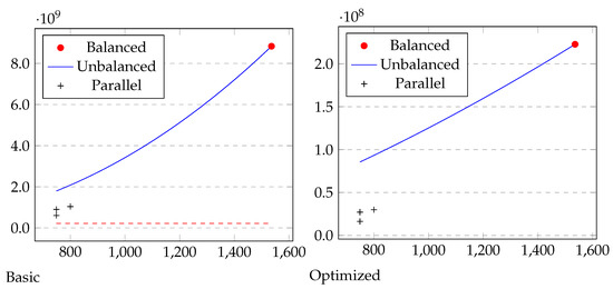 Figure 7. Note that the two sets of crosses for the multiprime version correspond to the two equivalence models: Lenstra—right side crosses and Regression—left side crosses. We also added a dotted red line in the case of the basic decryption (Algorithm 1), which represents the boundary of the optimized decryption algorithm (Algorithm 2) of the balanced version.