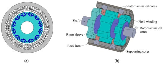 An alternative to WRSMs is the synchronous homopolar machine (SHM), with an excitation winding located and fixed at the stator. Such SHMs are widely used as highly reliable generators in passenger railway cars, as on-board generators for ships and aircraft [,], as automotive generators [] and in welding units []. In addition, recently, such SHMs have been used in traction drives [,,,]. The main advantages of SHMs, in comparison with WRSMs, are the elimination of the sliding contact that feeds the excitation winding on the rotor and high reliability. At the same time, SHMs retain the ability to control the excitation current, which makes it possible to reduce power losses in drives with a wide CPSR compared to IPMSMs.