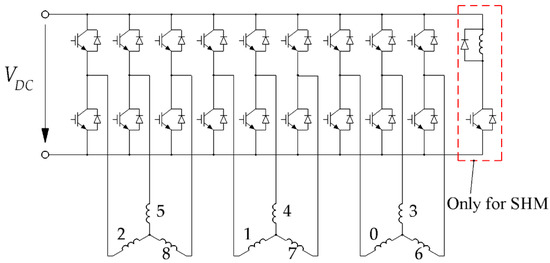Figure 2 shows the inverter circuit diagram for powering the considered traction motors. The phases are grouped by three and form three three-phase windings. The considered nine-phase inverter contains three separate three-phase inverters. The SHM also requires a single chopper connected to the DC link to power the excitation winding.