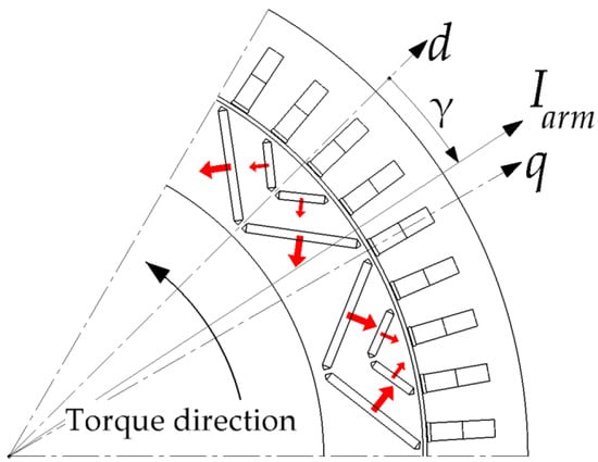 Interior permanent magnet synchronous motors (IPMSMs) are widely used in drives of electric and hybrid vehicles [,]. They have good performance in traction applications with a fairly wide constant power speed range (usually no more than 1:5) [,,]. Although the magnetic flux of the permanent magnets is not adjustable, the field weakening control strategy provides an extension of the constant power speed range (CPSR), and in contrast to motors with surface-mounted permanent magnet synchronous motors (SMPMSM), it utilizes the reluctance torque in the case of IPMSM design [].
