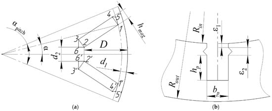 Figure 5 shows the main dimensions of the stator and rotor of the IPMSM. The rotor has two layers of magnets at each pole pitch. To simplify the picture, only one layer is shown. The geometry of the rotor was created by the following procedure. First, point 1 is set at angle α and at distance d1 from the outer rotor boundary. D and d2 define the position of point 2. The rectangles 1234 and 1′2′3′4′ are filled with magnets and are determined with magnet thickness hmag. Point 5 is located at a distance of d1 from the outer rotor boundary. Segments 45 and 4′5′ are parallel to the middle line of the pole. Triangles 145, 1′4′5′, 236, 2′3′6′ are filled with air. Parameters d1, d2, and hmag are the same for both magnet layers. Two values of parameters D and α correspond to two layers of the rotor pole. The stator parameters Rout = 331 mm, ε1 = 1 mm and ε2 = 2 mm are not varied during optimization.