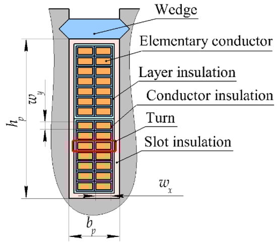 Each winding layer contains Nsec = 7 equivalent turns. Each equivalent turn contains Nx = 2 parallel strands. Figure 6 shows the layout of a stator slot. During the optimization, it was assumed that the width of slot bp and the height of the part of the slot occupied by the winding hp are related to the wire sizes wx and wy as follows: