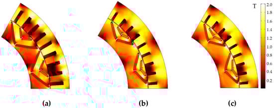 Modification of the geometry and magnitude of the flux density in the IPMSM during the optimization: (a) initial design; (b) result of the 1st step; (c) final result.