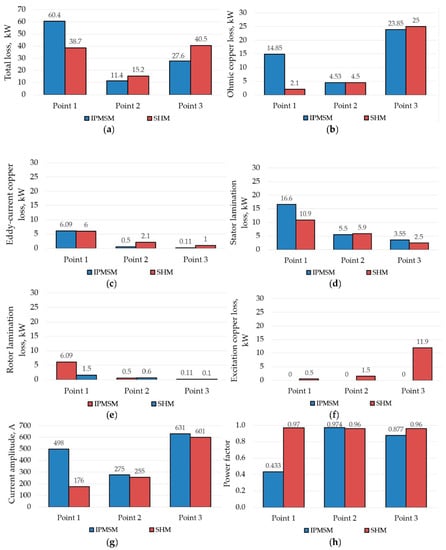 Performance comparison of IPMSM and SHM after the optimization for different operating points: (a) total loss; (b) armature ohmic copper loss; (c) armature eddy-current copper loss; (d) stator lamination loss; (e) rotor lamination loss; (f) excitation copper loss, kW; (g) amplitude of the armature phase current; (h) power factor.