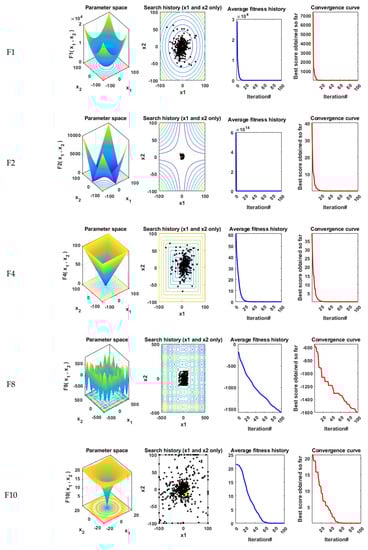 Qualitative metrics of nine benchmark functions: 2D views of the functions, search history, average fitness history, and convergence curve using ISNS algorithm.