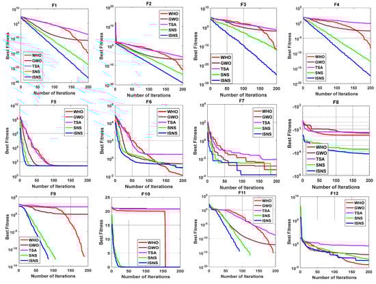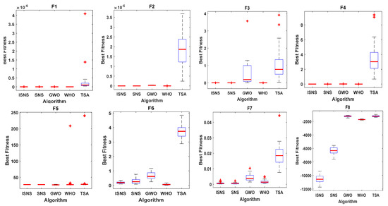 In this subsection, the qualitative metrics by the ISNS algorithm for 12 benchmark functions such as 2D views of the functions, search history, average fitness history, and convergence curve are displayed in Figure 10. The efficiency and the accuracy of the ISNS technique are assessed for 23 benchmark functions, including the values of the best, mean, median, worst, and standard deviation (STD) for the solutions attained by the original SNS technique, and three well-known algorithms, including the tunicate swarm algorithm (TSA) [50], the gray wolf optimizer (GWO) [51], and wild horse optimizer (WHO) [52], are displayed in Table 1. The benchmark functions F1–F13 are tested in 30 dimensions while the population size and maximum iteration number of each algorithm are 50 and 200, respectively. It can be noticed that the ISNS technique offers superior results on most of these functions in the best, median, worst, mean, and std values. The convergence curves of these techniques for these functions are presented in Figure 11. For more analysis to confirm the performance of the recommended technique, a boxplot of outcomes for each technique and objective function is demonstrated in Figure 12.