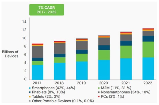 Due to the advancements of information technologies [,,], as well as the expansion of the IoT [,,,], the number of sensors and other IoT devices distributed by IoT users in the SIoT systems is growing explosively [,]. It is reported by Cisco that the number of the IoT devices and connections in the globe will be 13.5 billion by the year 2022, as can be observed from Figure 1 []. Accordingly, various multimedia applications, such as face recognition and augmented reality (AR), are appearing and have become popular in our daily life []. These multimedia applications are typically computation-intensive and need real-time processing []. However, the computation resources of these IoT nodes are insufficient enough to meet the demands of these applications [,].