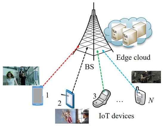The system architecture is introduced in this section. Suppose that there is a MEC-assisted SIoT system with N IoT devices and one base station (BS), as Figure 2 shows. Each IoT device has a multimedia application that needs a lot of computation resources to be computed. Besides, an edge cloud is deployed near the BS to provide computation resources. As far as the IoT device i is concerned, , its application can be represented by , where is the data size, and is the needed number of CPU cycles for computing this application. The user of the IoT device i can use the methods in [] to obtain the information of and . The IoT devices will make offloading decisions on whether to offload and process their applications in the edge servers or not. Let denote the application offloading decision made by IoT device i. If the IoT device i offloads its application via BS to the edge cloud, , otherwise, . It should be noted that the system architecture of this paper can be utilized in numerous real-life cases. For example, the IoT devices may correspond to networked cameras of the surveillance monitoring systems, whose sensed video data require real-time execution, and the multimedia applications can face recognition applications.