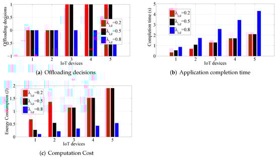 In this section, the effect of the values of weight parameters on the offloading decisions, application completion time, and consumed energy of IoT devices are analyzed. The values of are set to be 0.2, 0.5, and 0.8. Figure 3a shows the effect of weight parameter values on the application offloading decisions for IoT users. It can be observed from Figure 3a that as the data sizes of their applications are small, IoT users 1 and 2 compute their applications by their own devices under different values. However, for the IoT users 3, 4, and 5, as their applications have larger data sizes, they compute their applications by using the computation resources of the edge cloud under the values of 0.2 and 0.5. Furthermore, all the IoT users make the decisions on computing their applications on their own devices when the value is 0.8. This is due to the reason that offloading these applications to the edge cloud will consume more energy.