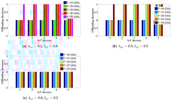 The effect of the edge cloud capacity on the offloading decisions of IoT users and the computation cost is analyzed in this section. The simulation results are shown in Figure 4, Figure 5, Figure 6 and Figure 7. Figure 4a–c depict how the edge cloud capacity affects the offloading decisions that IoT users will make versus the weight coefficient values. From Figure 4a, we observe that when , IoT devices 1 and 2 do not offload their applications even if the capacity of the edge cloud increases. This is because these IoT devices pay more attention to the completion time, and local processing will cost less execution time for them. IoT devices 3, 4, and 5 will offload applications with the capacity of the edge cloud increasing. Through Figure 4b, we find that the users of IoT devices would like to offload their applications if the edge cloud capacity increases. In particular, all the users of IoT devices offload their applications when GHz. When , we see from Figure 4c that all the IoT devices are to complete their applications locally. This is due to the reason that more attention is paid to the energy consumption in this scenario, and offloading applications to the edge cloud may cost more energy than the consumed energy in the local computing model. Therefore, IoT users would like to execute their applications locally. Figure 4a–c demonstrate that the offloading decisions that the IoT users make depend not only on the chosen weight coefficient values, but also the capacity of the edge cloud.