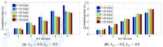 Figure 5a,b depict how the edge cloud capacity affects the application completion time under different values of weight coefficient. We see that the application completion time for each IoT device will decrease if the edge cloud capacity increases. By comparing Figure 5a,b, we find that the application completion time for each IoT device in Figure 5b is smaller than that in the Figure 5a under fixed edge cloud capacity. This is owing to the fact that the coefficient value of is smaller in Figure 5a.