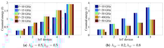 Figure 6a,b depict how the edge cloud capacity affects the consumed energy under different values of weight coefficient. By comparing the two figures, we observe that the consumed energy for each IoT device in Figure 6a is lower than that in Figure 6b. This is owing to the fact that the coefficient value of is bigger in Figure 6a.