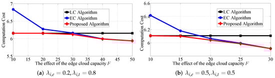 Figure 7a,b show how the edge cloud capacity impacts the computation cost with different values of weight parameters. The proposed algorithm is compared with two baseline algorithms. It is obviously shown in these figures that the computation costs under the EC Algorithm and the Proposed Algorithm decrease with the increase in the edge cloud capacity. As the edge cloud capacity does not affect the local computation cost, the computation cost in the LC Algorithm has the constant value. From Figure 7a,b, as anticipated, the Proposed Algorithm can achieve less computation cost compared with the LC Algorithm and the EC Algorithm. By comparing Figure 7a,b, it can also be obviously observed that the computation cost is lower when . Moreover, the two figures show that the computation cost in the LC Algorithm is lower than that in the EC Algorithm until the edge cloud capacity reaches a threshold value. When , the threshold value is comparatively smaller.
