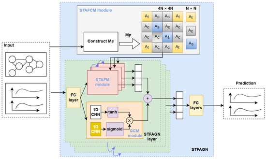 In this paper, we design a spatial–temporal adaptive fusion convolution layer to extract long-term spatial–temporal dependencies in the GCM module. The layer also can establish the self-adaptive fusion adjacency matrix to supplement spatial–temporal connections in the STAFM module. In Figure 1, the STFAGN layer represents the spatial–temporal adaptive fusion convolution layer. The layer mainly consists of the GCM and STAFM module.